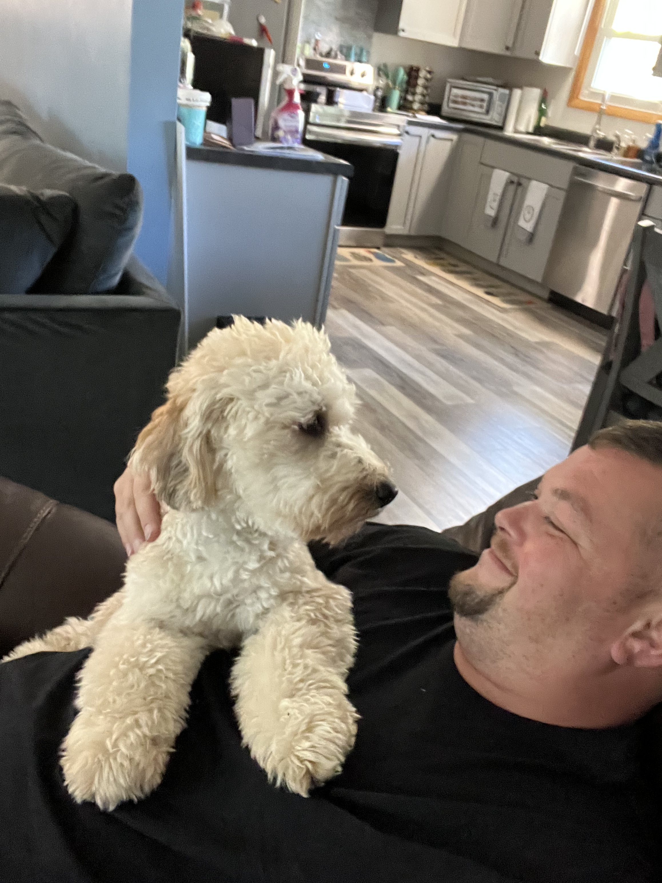 David is a miniature Whoodle β small in size, enormous in heart. He's the kind of dog who doesn't just greet you at the door. He crashes into you. Tail going, eyes bright, like every single time you come home is the best moment of his entire life.